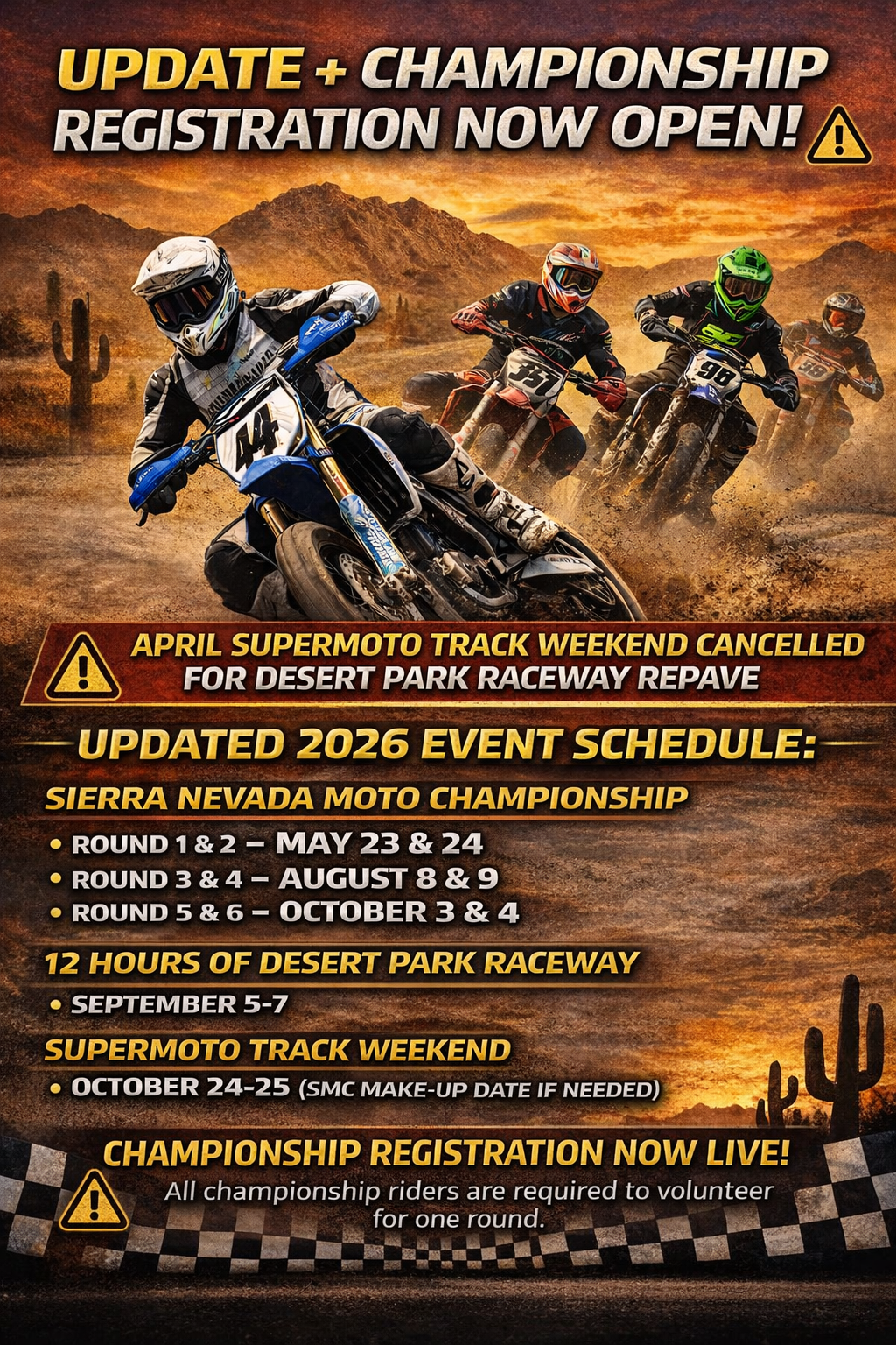 The April 25–26 Supermoto Track Weekend has been CANCELLED to make room for the Desert Park Raceway repave project. We know this is a bummer, but the upgrades will be well worth it and will help make the track better than ever!
